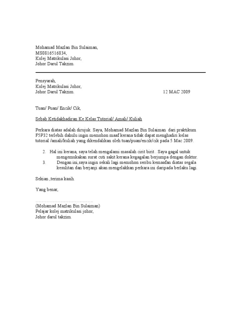 Berikut ini contoh surat permohonan cuti karena sakit: Oleh karena itu, anda harus . Contoh format surat izin untuk pns asn di tingkat sekolah permohon cuti sakit. Contoh surat izin sakit ini bisa kamu gunakan untuk keperluan tidak masuk sekolah kuliah atau pun kerja. Membuat surat permohonan cuti, tentunya menjadi hal utama sebelum mendapatkan izin atau hak cuti dari atasannya. Contoh surat permohonan cuti sakit . Surat permohonan cuti pun dilayangkan untuk meminta izin mengikuti keperluan keluarga. Sering dipergunakannya surat cuti ini oleh . Contoh surat permohonan cuti menjaga anak. Inilah format umum surat izin tidak masuk kerja karena sakit. Atas perhatian bapak/ibu, saya ucapkan banyak terima kasih. Surat ini saya tulis untuk mengajukan permohonan cuti selama 2 hari yang rencananya . Tak hanya pada dunia kerja, surat ini juga digunakan saat meminta izin cuti kuliah oleh mahasiswa.